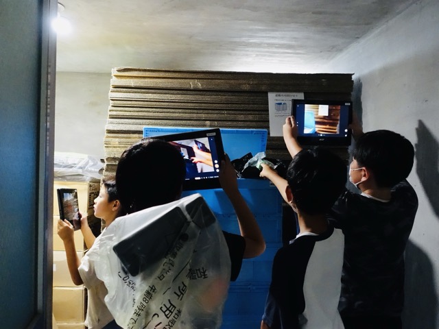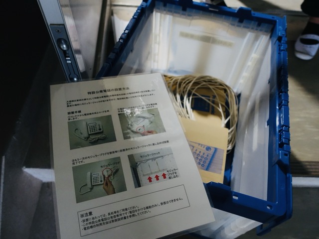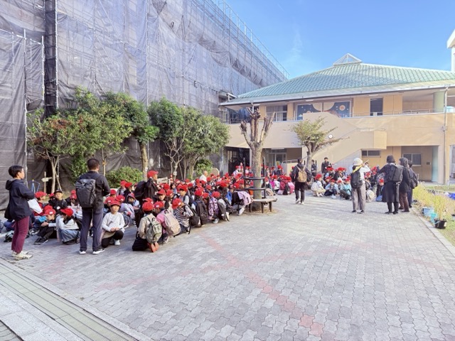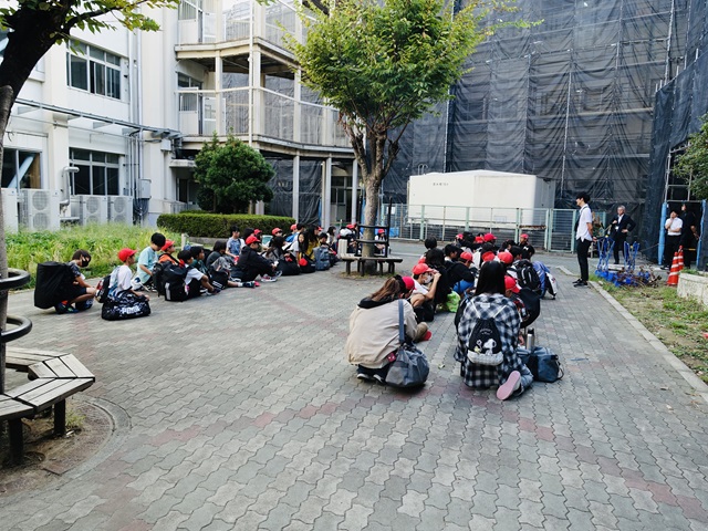 ※防災の学習。校舎内の備蓄倉庫前で待機中…