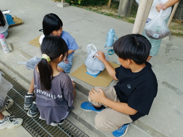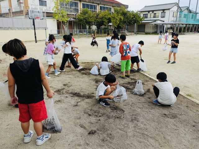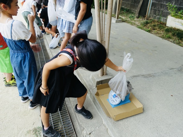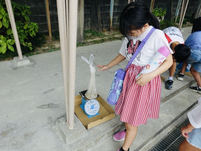 ※算数・重さの学習で砂場で砂を詰めてみて…