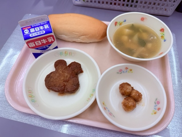 「うさちゃんハンバーグ・お月見団子・中華スープ・パン・牛乳」でした。団子も食べやすい小さいサイズで、ハンバーグはうさぎちゃんの形をしています。なんだか可愛いですね。ごちそうさまでした。