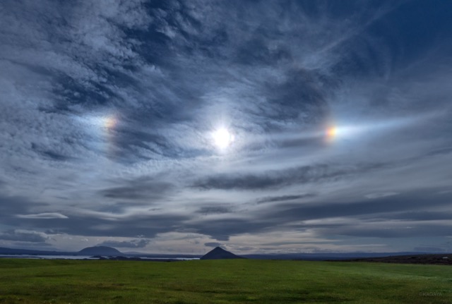さて、閑話休題。今日は気象現象のお話です。すごく珍しいのですが、度々お借りしているKAGAYAさんの写真から一つ。写真中央が太陽、その両脇に色づいた輝きが幻日、そして、太陽から左右に伸びて幻日を貫く光が幻日環です。ほんの一瞬の現象です。神秘的ですね。