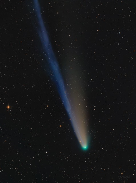 ところで、KAGAYAさんの撮影したレモン彗星は姿くっきり。宇宙空間に吹き荒れる太陽風にたなびく、青いイオンテイルと白っぽいダストテイルが伸びているのがわかります。2枚目はiPhoneで撮影し、トリミングした写真です。夕方18時過ぎから1時間が撮影のチャンスです。見られる方は西に開けた場所を選ぶとよいですよ。