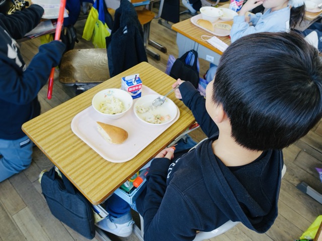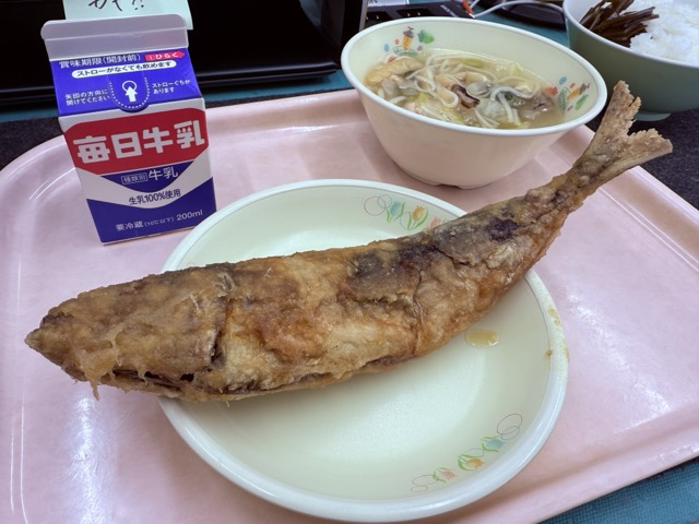 ↑5年生の給食には丸ごとの立派なアジ。すごい!ほぐしながら食べました。