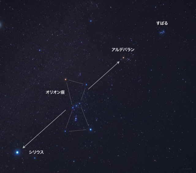 オリオン座のベルトの位置の三つ星から左下に伸ばすと全天で一番明るい星・おおいぬ座の「シリウス」です。こちらは一等星。青白くてかなり目立ちます。そして右上に伸ばすとおうし座の「アルデバラン」。こちらも一等星です。オレンジ色をしています。そしてさらに伸ばしていくと若い星たちの集まり、「プレアデス星団」があります。いくつもの星の集まりで肉眼ではボヤッと見えることが多いです。日本名は昴(すばる)。日本古来からの呼び名ですね。よかったら晴れた夜、お子さんと見てみてくださいね。