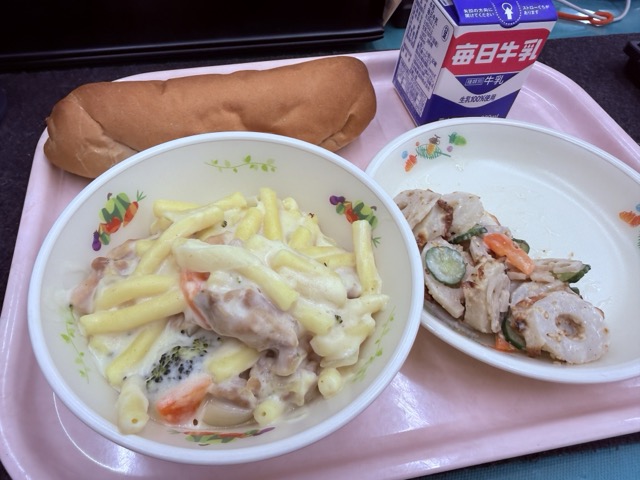 さて、今回の記事は給食週間が始まったあとの2日に渡る給食のご紹介です。まず、28日の昨日は2年生の国語の教科書で学習する「あなのやくわり」に合わせて考えてくださった献立です。「マカロニのクリーム煮」、「れんこんとちくわのサラダ」でした。2年生の教室に行くと、今回の献立が2年生に合わせて作られたことを説明しているので、「先生、美味しいよ!」「おかわりしたい人?はい!」と笑顔で食事をしていました。食事中に給食委員会の子の放送もしっかり聞こえていて、献立の解説を聞き入っていましたね。