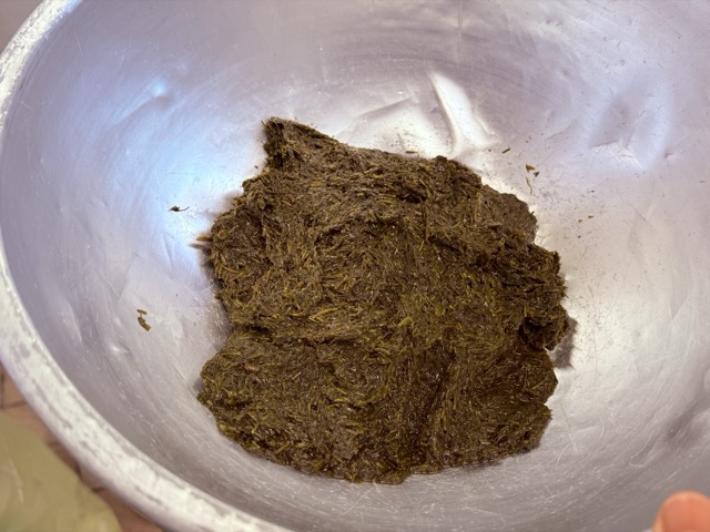 そして、今日の給食。「あかもくのとりてん」と「すろっぽだいこん」。あかもくとは和歌山県の日高地方で取れる海藻で、食物繊維やミネラルが豊富で冬から春にかけて旬を迎えるものです。収穫後は刻んで販売されています(写真)。とりてんの揚げる衣に混ぜていただきました。それから、「すろっぽだいこん」は和歌山の郷土料理になります。昭和の雰囲気が出ていて懐かしい優しい味わいでした。ごちそうさまでした。