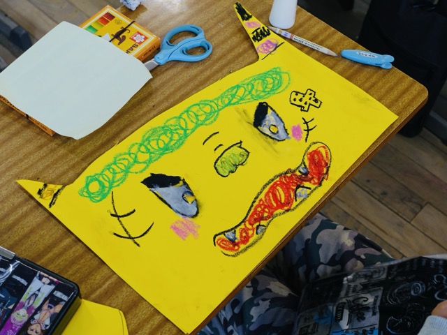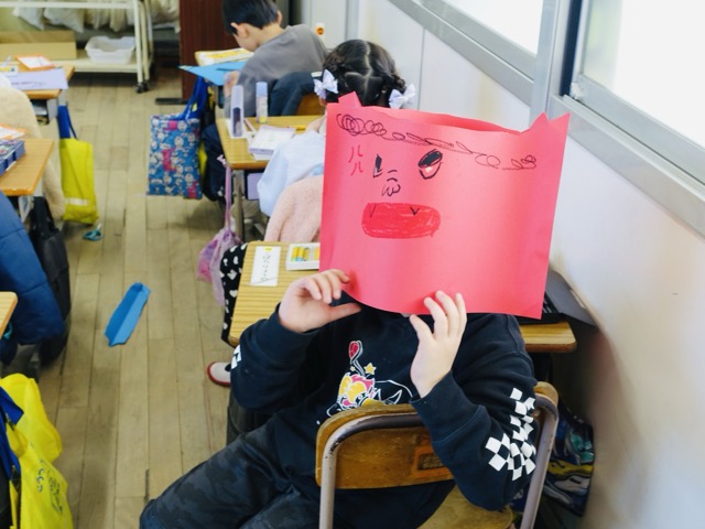 ↑できた鬼のお面を被ると、鬼に早変わり!