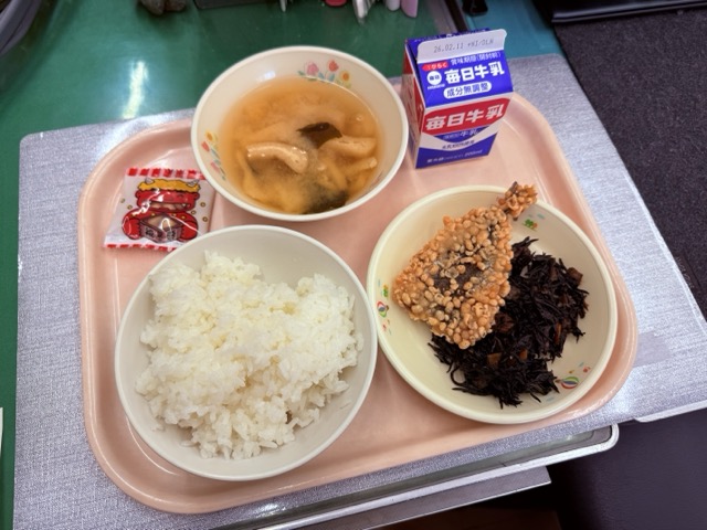 今日は節分の日なので、給食もそれに沿ったメニューが出ました。メインのイワシフライは揚げ玉をまとっていて、食感もサクサク。美味しいと評判でしたよ。3日のメニューは「いわしのサクサクあげ」、「ひじきの煮物」、「味噌汁」、「ふくまめ」でした。