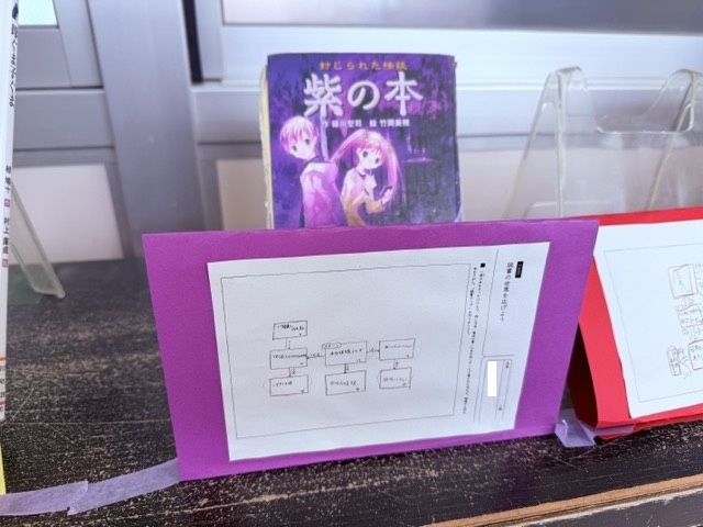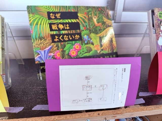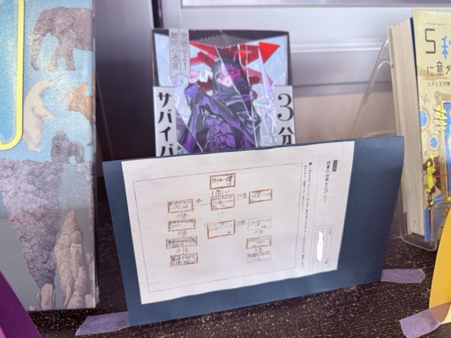 そして、続くは5年生の教室の廊下には「図書マップ」。それぞれの本に関わる筆者や関連した本がマッピングで表現されています。一目でその本の世界が広がります。