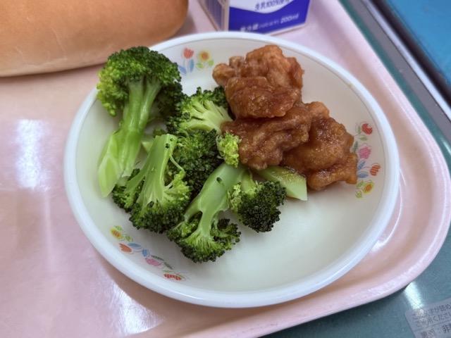 4日の献立には5年生が収穫したブロッコリーが一部、給食に使われました。酷暑に負けずなんとか育ってくれました。やったね!