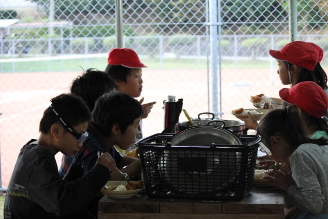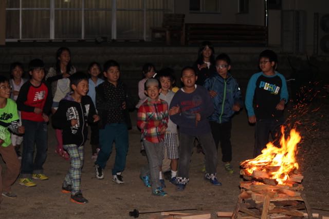 初めてのキャンプファイヤ_宿泊学習5年 投稿日:2014年10月20日 10月16日、17日の1泊2日で5年生が紀北青少年の家で宿泊学習をおこないました。入所式の後は、みんなでドッチボールをしてからお昼を食べました。午後は、飯盒炊爨をみんなで力を合わせてやりました。マッチからの火おこしからまきに火をつけるのも初心者にはなかなか大変で良い経験になりました。みんなと野外で食べるカレーは一味違っておいしい!夜は、キャンプファイヤーとスタンツをしました。みんな燃えました。翌日は、手作りでピッツアを作って食べました。みんなで手作りしたものっってなぜか美味しい。