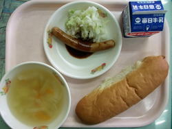 フランクフルトのトマトソース ブロッコリーのゴマ酢 もずくスープ |