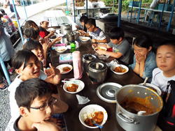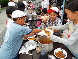 | ↑カレーの鍋は自然の家の先生が担当してくれました↑ | ↑出来上がったカレーを取り分けて!↑ | ↑自分の分を配膳します!↑ | |