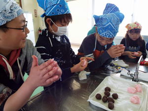 | ↑まずは“さくらもち”づくりに挑戦です!↑ | ↑ピンクに染まったもち米にあんこを包みます↑ | |