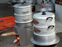 | ↑もち米は前日から水につけ、準備万端!↑ | ↑体育館前にセットされた臼↑ | ↑もち米を蒸します!↑ | |
