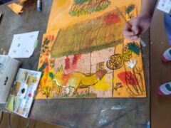 落ち葉のスタンプを押した画用紙の上にクレパスで下がき。