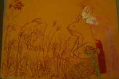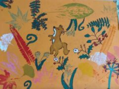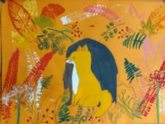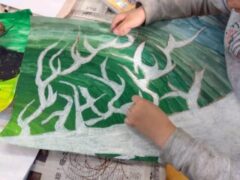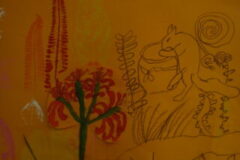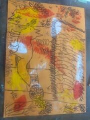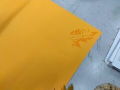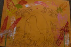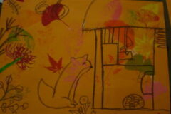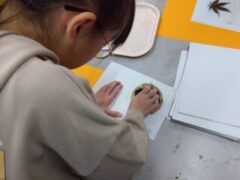 落ち葉のスタンプを押した画用紙の上にクレパスで下がき。