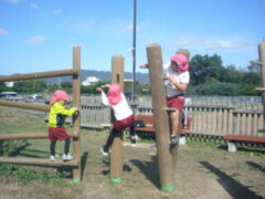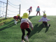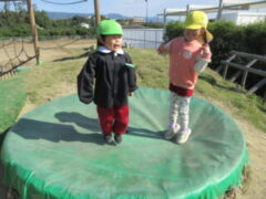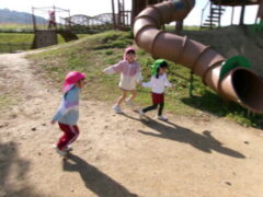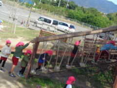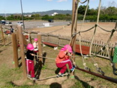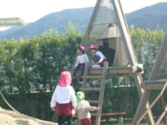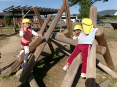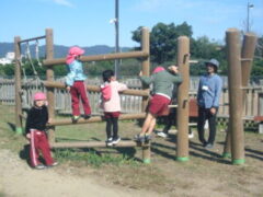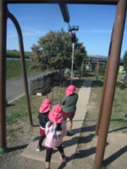 到着すると、子供たちは広場にあるたくさんの遊具で元気いっぱいに遊び始めました。初めて挑戦する遊具にワクワクしたり、異年齢の友達と関わりながら遊んだりと、普段とは違う一面もたくさん見られました。