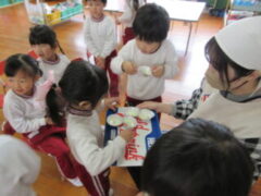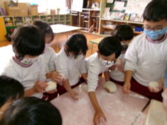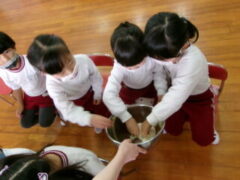 その後は子供たちの出番です。友達を応援する姿も微笑ましく、会場は一体感に包まれました。5歳児さくら組は、ついたお餅で鏡餅づくりに挑戦。柔らかいお餅に苦戦しながらも、楽しそうに丸めて重ねていました。