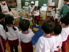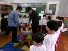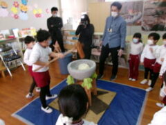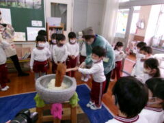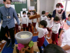 園では毎年、石臼と杵を使った餅つきを行い、日本の伝統文化にふれています。子供たちの笑顔と掛け声が響き渡り、楽しいひとときになりました。