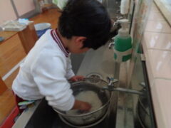 前日に子供たちはもち米を洗い、当日は蒸し器で蒸し始めました。園舎には炊き立てのお米の香りが広がり、子供たちは「いいにおい!」「まだかな?」と何度も様子を見に来ていました。蒸したもち米をひと口食べると、「あー美味しい!もっと食べたい!」と笑顔があふれました。