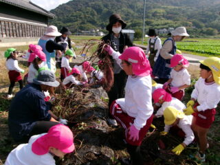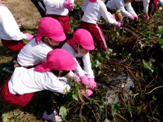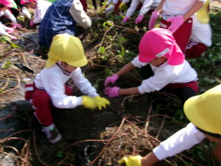 5月、地域の方のご厚意で畑をお借りし、子供たちと一緒にサツマイモ掘りを行いました。 畑に到着すると、さっそくツルを引っ張り出す子供たち。土の中にしっかり根を張ったサツマイモはなかなかの強敵で、思わず尻もちをついてしまう場面もありましたが、子供たちは負けません。友達と力を合わせてツルを引っ張ったり、土をかき分けたりしながら、大きなお芋を目指して一生懸命掘り進めました。