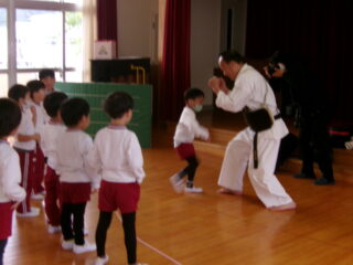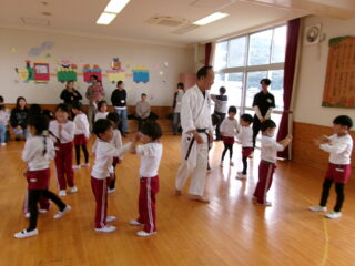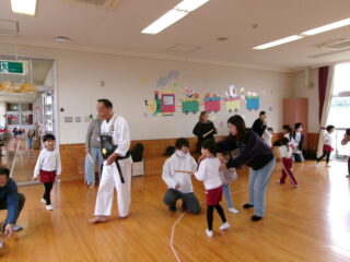 今週は園開放を行い、毎日たくさんの保護者の方に園児の様子を見に来ていただいています。 本日は、和佐地区公民館長の中村先生を講師にお迎えし、5歳児が護身術を体験しました。保護者の皆さまも一緒に参加し、子供たちと共に「自分の身を守る方法」について学びました。