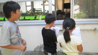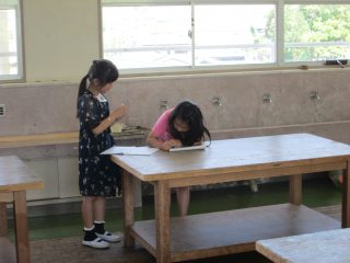 火起こし体験では、二人組になって協力して火起こしをしました。普段は簡単につくはずの火がなかなかつかず、「昔の人、大変や~!」「今は便利なんやな」といった声が聞こえてきました。