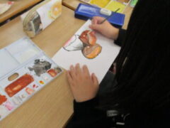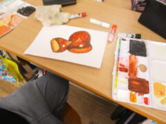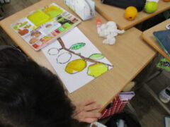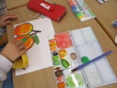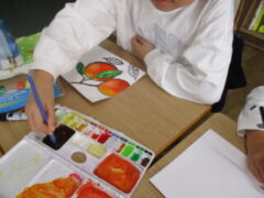 3年生はミカンや柿、栗、さつまいもの絵を描いた絵手紙を作成しています。