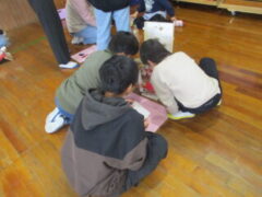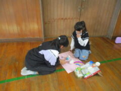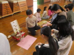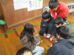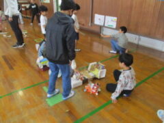 授業参観後、クラスで「おもちゃランドに他に誰を招待したいか」を話し合いました。「もうすぐ6年生が卒業するから、最後に一緒に遊びたい!」「前にお芋ほりに誘ってくれたから、今度は自分たちが誘いたい。」という意見が多く出て、6年生を招待することに決まりました。さっそく、ポスターやオリジナルチケット作りに取りかかり、「どうしたら楽しんでもらえるかな?」と相手のことを考えながら、心を込めて準備を進めました。おもちゃランド当日、体育館にはたくさんの6年生が来てくれました。少し緊張しながらも、「いらっしゃいませ!」「楽しいですよ~」と元気に声をかけ、自分たちで工夫して作ったおもちゃで一緒に遊び、体育館は笑顔でいっぱいになりました。