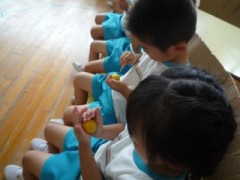 今日は未就園児の集い。これも雨天のため、水遊びの予定を変更・・・。