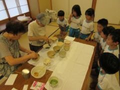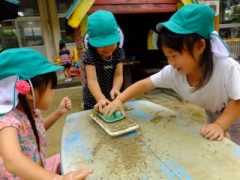 おかわり4つ食べた子もいましたね。家ではスイカを食べない子も、ゆり産スイカは特別なようで、おかわりして食べていました。 お休みしていた子も、登園日にまた、収穫できると思います。待っていてね。