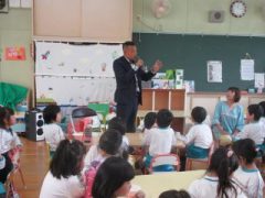 「木は大きく生長するまで、60年くらい・・・みんなは、立派な大人かな?幼稚園にどんぐりの木ができたらいいね、そしたら、大好きなドングリをいつでも拾えるね。」