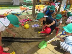 泥や水が心地よくなりました。今年は、この時期からすでに夏日が続いて、みんな戸外遊びでも汗をいっぱいかいて遊んでいます。水筒のお茶の量を多めに、よろしくお願い致します。