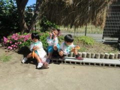 朝からコオロギを見つけた子達は、『コオロギのおうち』を作ろうと奔走し始めました!小さい組の友達も興味津々 一緒に向かいます。