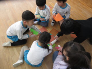 アイデアがたくさん出てきて、園児も興味津々です。今日は、風もわりと吹いていたので、それも工夫を凝らす一つの機会や、気づきに繋がる機会になったのではと思います。