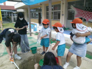 お姉さんたちが一緒に掘ってくれた穴にペットボトルの水を入れると…