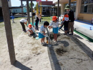 一緒に砂場遊びを楽しんでいます。