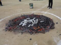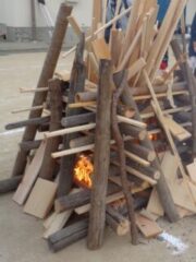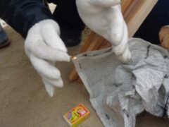 子どもたちは、さつまいもを新聞紙で包み、それを濡らしてもらい、その上からアルミホイルで丁寧に包むという順番で準備をしました。おきの状態(※)になったやぐらの中へ、期待を込めてお芋を投げ入れました。